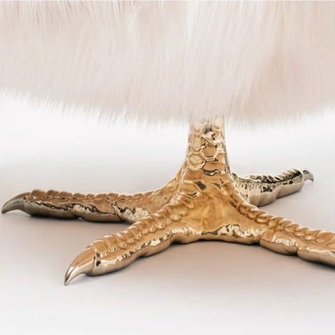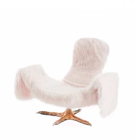 Descrizione: Poltrona con struttura in poliuretano morbido, braccioli, schienale e poggiatesta regolabili, rivestimento in eco pelliccia a pelo lungo, base in poliuretano rigido con finitura sputtering oro lucido. Special Collection