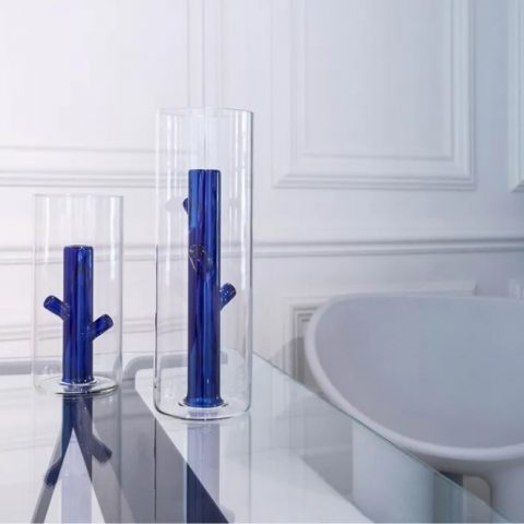 Descrizione: Vaso in vetro borosilicato lavorato a mano tramite soffiatura con interno di colore blu cobalto.